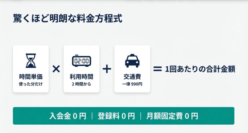 📌 イチロウの料金 = 時間単価 × 利用時間 + 交通費(990円)