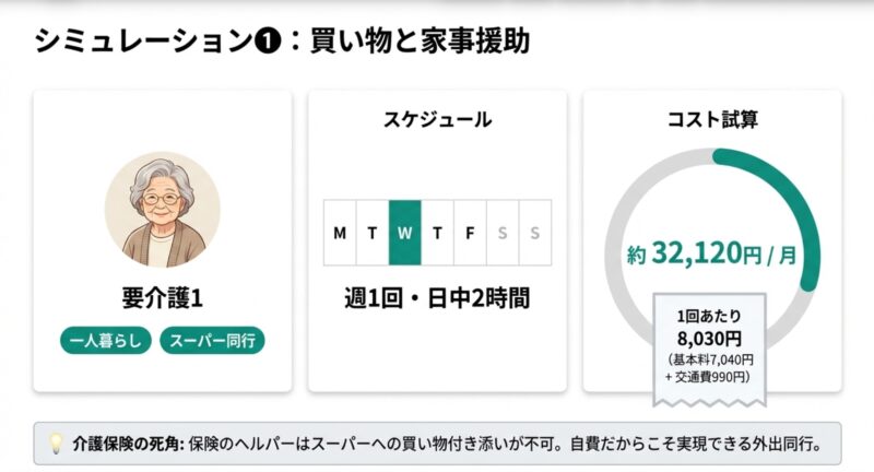 月に約3.2万円です。介護保険の訪問介護(生活援助)は1〜3割負担なので安く感じますが、保険のヘルパーはスーパーへの買い物付き添いはできません。外出先まで同行してもらえるのは自費サービスならではです。