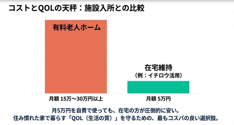 有料老人ホームの月額費用は15〜30万円以上が一般的です。「イチロウを月5万円使っても、まだ在宅のほうが圧倒的に安い」というケースは珍しくありません。在宅介護を続けながらQOL(生活の質)を守る選択肢として、イチロウはコスパの良いサービスといえます。