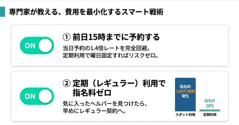 • 前日予約・定期利用を活用すれば費用を抑えられる