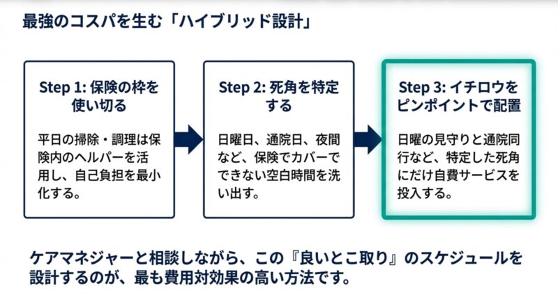 介護保険でカバーできる部分は保険内のサービスを使い、保険ではカバーできない部分だけをイチロウに頼むのがベストです。「平日の掃除・調理は保険内のヘルパー、日曜日と通院日だけイチロウ」という使い方が費用対効果の高い組み合わせです。ケアマネに相談しながら設計するのがおすすめです。
